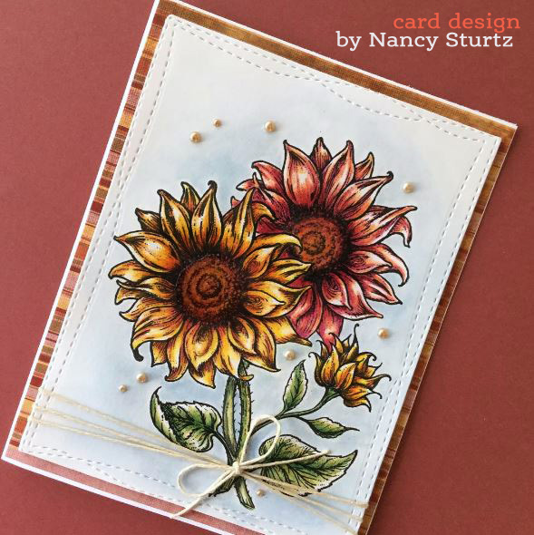 Nancy Sturtz wowed me with her clean and classy design sprinkled with pearls and tied up in twine! How fun to see TWO of the large sunflowers together, created with masking. Love the two-tone effect of her coloring, stamped with Power Poppy's In Praise of Sunflowers stamp set.