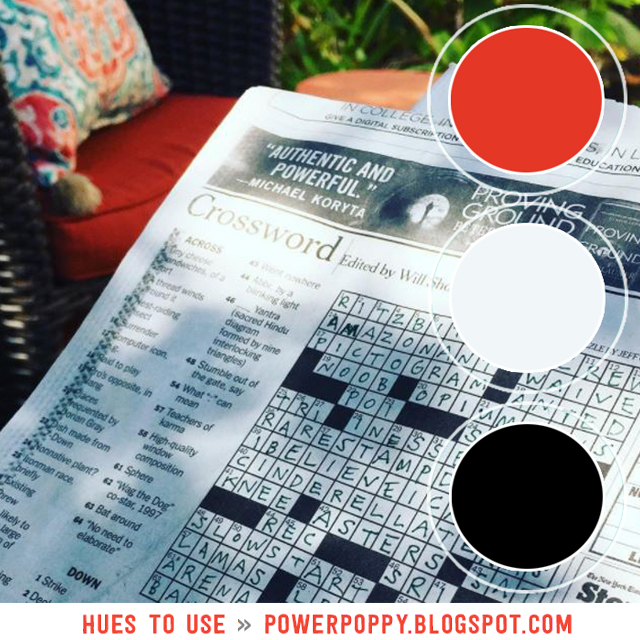Today's little inspiration point is one that's super close to our creatively fearless leader's heart. Yes, that would be Ms. Marcella!! Anyone who knew her amazing, artful, creative, joyful, exuberant, charismatic, and endearing mama --- Susan -- knew that she loved her New York Times crossword puzzles. As Marce says, she "loved to work them, excelled at completing them, and delighted in triumphing over every single square." So, when I spotted this photo below on Marcy's IG feed, I knew we had to make it the centerpiece of a Hues to Use Challenge. This is a photo of Marcy remembering her mama and rising to the crossword of all crossword challenges in honor of this special lady. On top of that, who doesn't love a good, vibrant, and "contrasty" combo of pitch black, alabaster white and cardinal red?