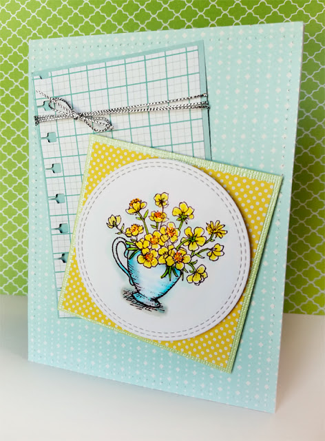 I re-cued this card because in addition to the color combo being just perfect, I also really loved the clean design. It is really a pretty easy layout and one that's fresh and fun! After coloring up these itty bitty blossoms from the Cuppa Buttercups digital stamp set, I thought this layout would be a fun one to plop down my colored up and die cut image! I went on the simple side for coloring and only used a few markers Y06, Y08, Y0000, BG0000, BG11, BG13, YG06 C01, and C03. After I was done coloring, I had to add a little razzle dazzle with some glitter glue! See?