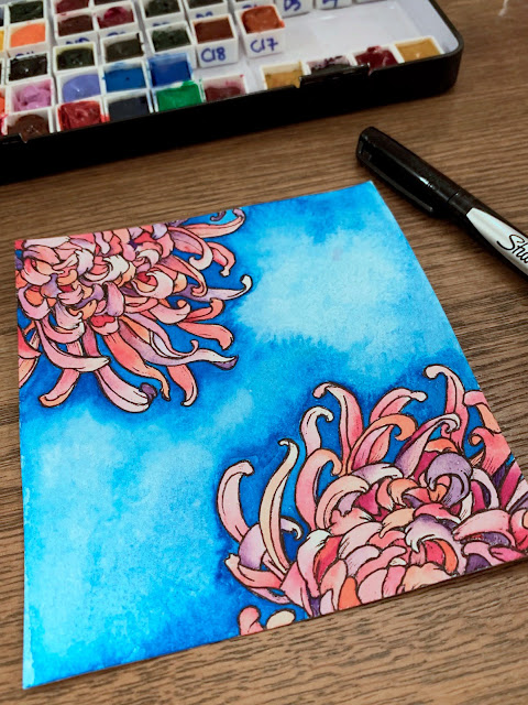 I love the details in this flower, but let's be real, it does take time to color this beautiful illustration! That's why using a simple watercolor was a must for me. Alternating the shades of red and purple was easy and appealing to the eye.