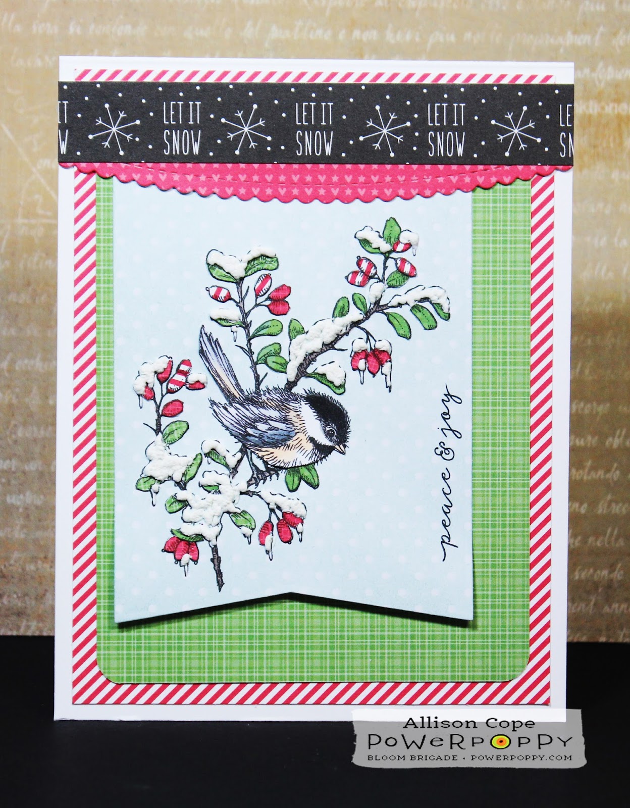Our first cards are by Jo Ann Danchik, whose recent flurry of Christmas cards on Instagram showcase a gallery of clever ideas (follow her at @jadanchik). She is definitely looking at her stamps with fresh eyes and pairing up images and techniques with a total wow factor. Always, she accompanies her posts with a sweet story and the thoughts behind her ideas. Check out how Jo Ann made a background with Power Poppy’s Frosted Gingerbread border stamp. Pop over to her account to see the full background, and how she mustered up the courage to slice it in TWO to make double the cards.