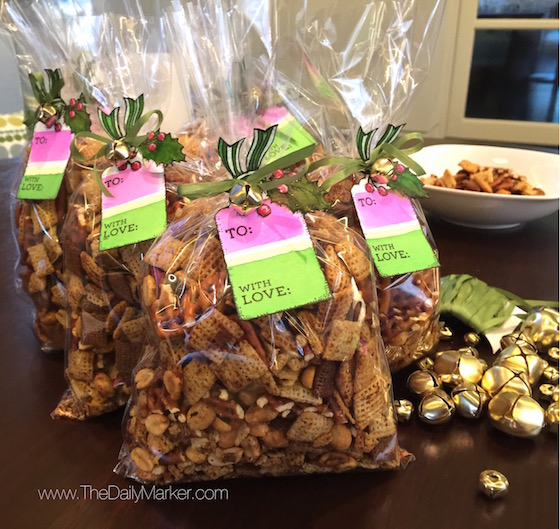 Putting the Chex Mix in a zip lock baggie was a practical choice for me. Then I saw the Power & Spark Challenge so I decided to ramp up my homemade treats with some homemade tags, ribbon & jingle bells.