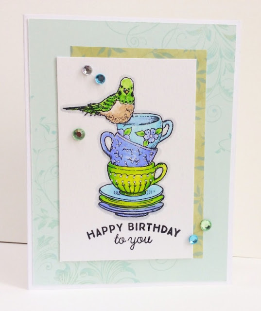 Heidi over at "My Little Stamping Blog" made us smile with this sweetly colored budgie from Power Poppy's set Short Stacks! We loved the vibrant colors and the contrast with that peaceful, easy pastel background. And, who doesn't love a bit of bedazzling!