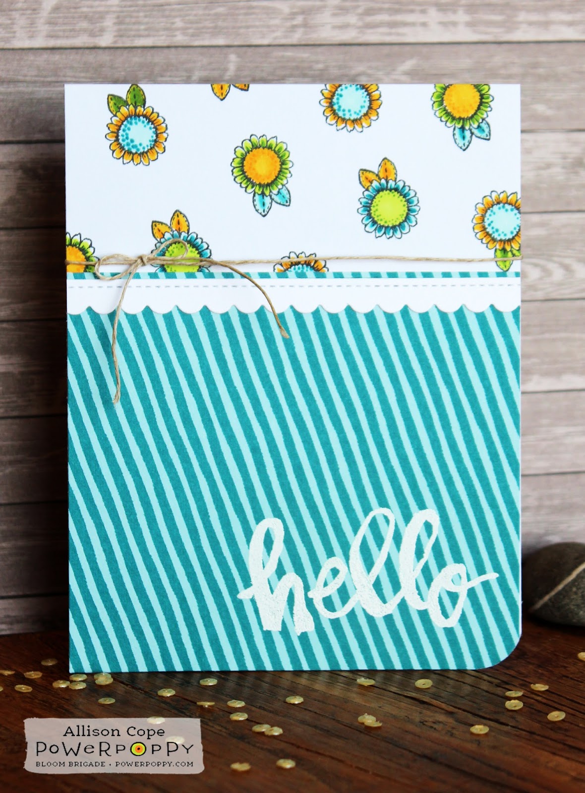 To begin this card, I knew I wanted to use the basic design of the bag; stripes on the bottom and little blooms on the top. So I found a fun striped paper and then pulled the teal from the strip into the colour of the blooms.